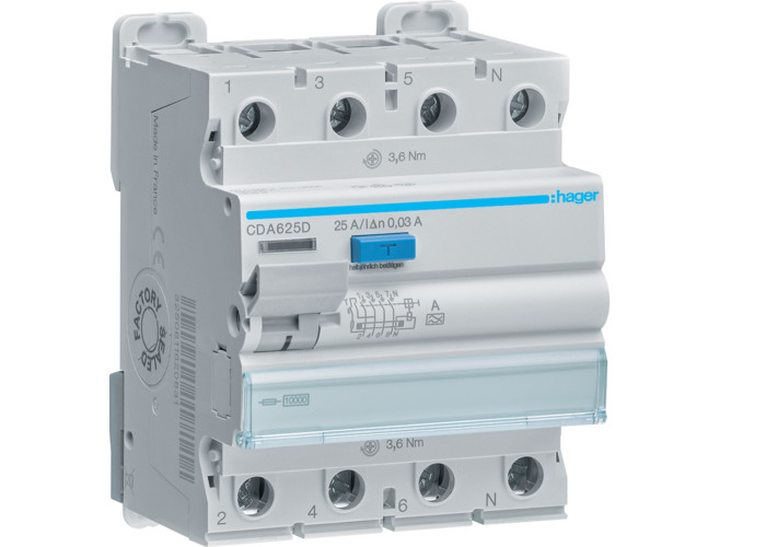 {'Номінальний струм': '25 A', 'Селективний захист': 'ні', 'Короткочасне затримане спрацьовування': 'ні', 'З блокувальним пристроєм': 'так', 'Струм короткого замикання Icw': '10 kA', 'Під`єднуваний переріз багатодротового провідника': '1-16 mm²', 'Вибухозахищений': 'ні', 'Кількість полюсів': '4', 'Глибина вбудовування': '70 mm', 'Метод монтажу': 'DIN-рейка', 'Під`єднуваний переріз твердого провідника': '1-25 mm²', 'Номінальна напруга': '400 V', 'Струмова витривалість до ударного струму': '3 kA', 'Номінальна ізоляційна напруга Ui': '500 V', 'Тип напруги': 'Змінний струм', 'Частота': '50 Гц', 'Номінальний струм витоку': '0.03 A', 'Номінальна напруга витримування удару Uimp': '4 kV', 'Ширина в кількості модульних відстаней': '4', 'Ступінь забруднення': '2', 'Ступінь захисту (IP)': 'IP20', 'Температура навколишнього середовища під час роботи': '-25-70 °C', 'Тип витоку струму': 'A', 'Можливе додаткове обладнання': 'так'}