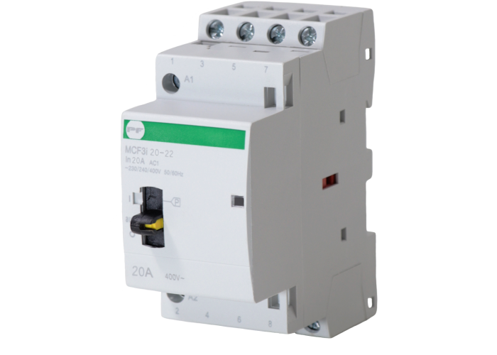 Модульні магнітні пускачі MCF3i призначені для дистанційного кeрування в електричних колах змінного струму частотою 50/60 Hz і напругою до 400V. Використовуються модульні магнітні пускачі MCF3i в побуті для автоматизації та управління процесами, а також у системах вентиляції, освітлення та кондиціонування. Контактор має 4 позиції на вибір: O - постійно вимкненоAUTO - перемикається, коли напруга живлення подається на котушкуI - ввімкнено вручну, автоматично повертається в положення “AUTO” після вимкнення напруги живленняI + P - постійно увімкнено
