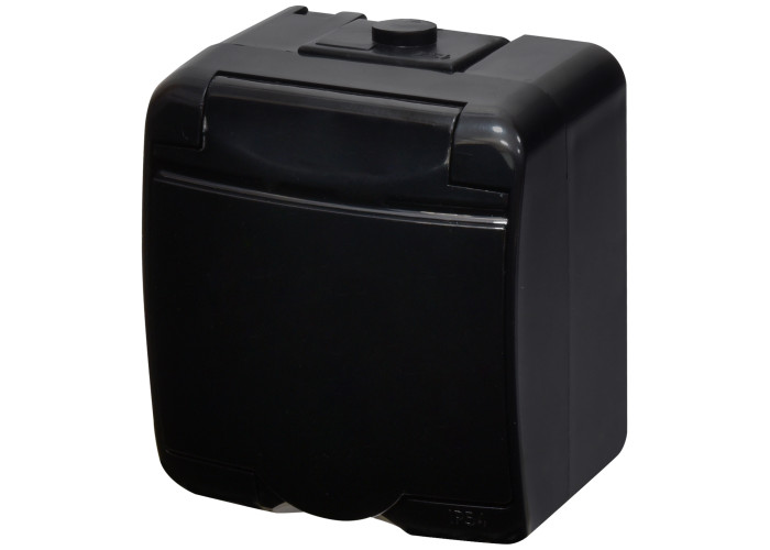 Розетка 1-я с ж/к Schuko RHE-1s-BL (черная/черная крышка, IP54)