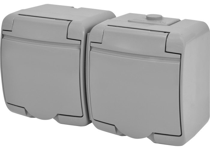 Розетка 2-я с ж/к Schuko RHE-2s-SR (серая/серая крышка, IP54)
