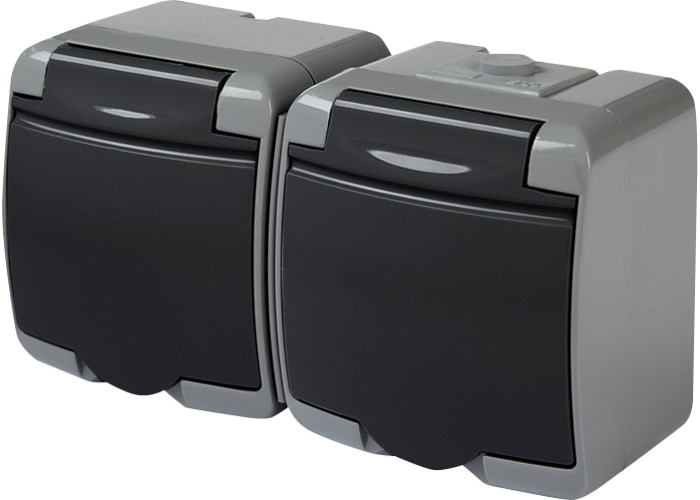 Розетка 2-я с ж/к Schuko RHE-2s-SRG (серая/графит. крышка, IP54)