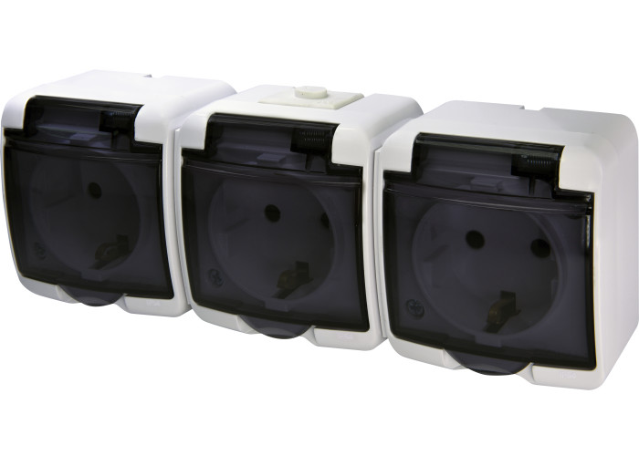Розетка 3-на с/к Schuko RHE-3sd (белая/прозрачная крышка, IP54)