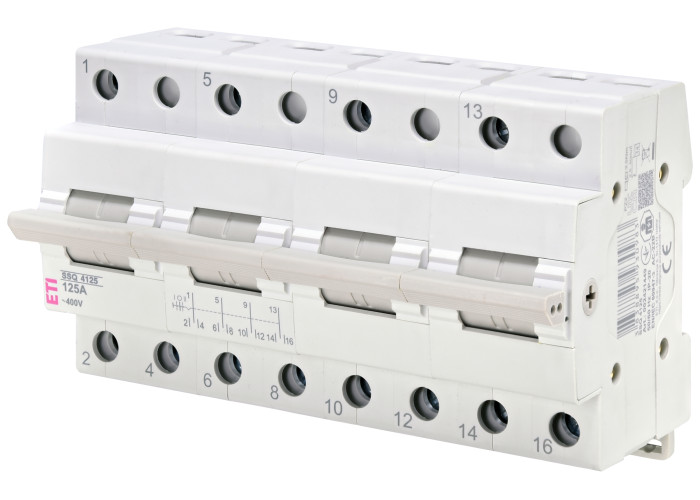 Модульний перемикач навантаження SSQ I-0-II (мережа-генератор) забезпечує просте та надійне перемикання джерел живлення у разі аварійних ситуацій (наприклад, відключення електроенергії). Він призначений для встановлення у розподільні щити. Такий рубильник не має теплового та електромагнітного розчіплювача (не захищають від струмів короткого замикання та перевантажень). Можливе пломбування у положенні (I) та (II).