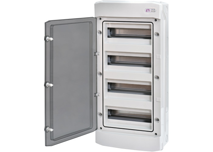Розподільні щити серії ЄСП зовнішнього виконання застосовуються для монтажу захисних, сигнальних і расределітельних пристроїв модульного виконання і забезпечують ступінь захисту IP65. Сфера їх застосування - промислове і житлове будівництво. Щити виготовляються з термопластика ABS, який володіє високими електричними і механічними експлуатаційними характеристиками. Корпус щита оснащений шиною TH35, клемами PE і N. Лицьова частина щита оснащена елементами швидкого монтажу для з'єднання з корпусом і прозорими дверцятами. Дверцята щита має можливість кріплення як справа, так і зліва. Отвори для підведення кабелів живлення мають різні діаметри і розташовані з усіх боків щита. У стандартну комплектацію щита серії ЄСП входить DIN-рейка, кріпильні аксесуари, заглушки, маркувальні наклейки, а також нейтральні і заземлюючі шини (клеми). Заглушка забезпечує надійне поділ між металевими елементами кріплення і діелектричним підставою щита. Щит має спеціальний виступ, що дозволяє здійснювати його пломбування і захищає від несанкціонованого доступу.