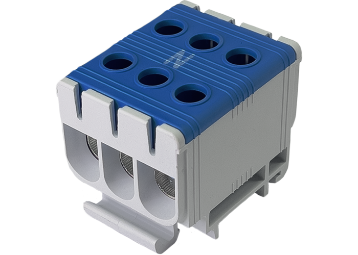 Клеммы FT 3Р предназначены для создания электрических соединений и подключения проводов и кабелей датчиков, исполнительных устройств, контрольно-измерительных приборов и компонентов силовой электроники, заземления. Монтируются в электрощитках и панелях управления электрооборудованием. Внутри клеммы полюса электрически соединены между собой. Корпус отдельных элементов имеет разный цвет, что соответствует цветовой маркировке проводов: серый или коричневый – фаза; синий – нейтраль; желто-зеленый – заземление. Особенностью данных клемм является возможность перехода с алюминиевого на медный проводник.