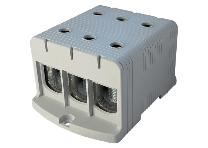 Клеммы FT 3Р предназначены для создания электрических соединений и подключения проводов и кабелей датчиков, исполнительных устройств, контрольно-измерительных приборов и компонентов силовой электроники, заземления. Монтируются в электрощитках и панелях управления электрооборудованием. Внутри клеммы полюса электрически соединены между собой. Корпус отдельных элементов имеет разный цвет, что соответствует цветовой маркировке проводов: серый или коричневый – фаза; синий – нейтраль; желто-зеленый – заземление. Особенностью данных клемм является возможность перехода с алюминиевого на медный проводник.