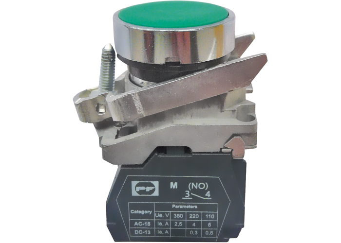 Выключатель кнопочный FP тайный нажимной толкатель, без фиксации. Цвет: зеленый. Используется в промышленных распределительных устройствах, пультах управления промышленным оборудованием, а также для управления технологическими процессами и системах автоматизации.