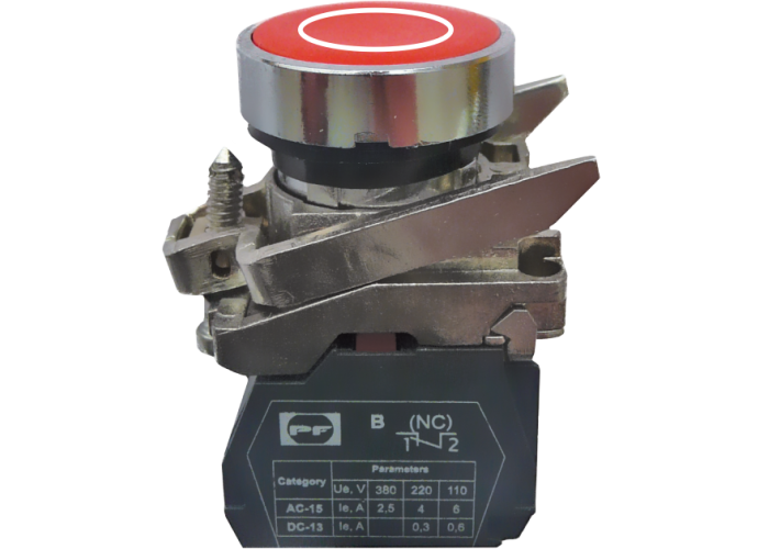 Выключатель кнопочный FP тайный нажимной толкатель, без фиксации. Цвет: красный с маркировкой круг. Используется в промышленных распределительных устройствах, пультах управления промышленным оборудованием, а также для управления технологическими процессами и системах автоматизации.