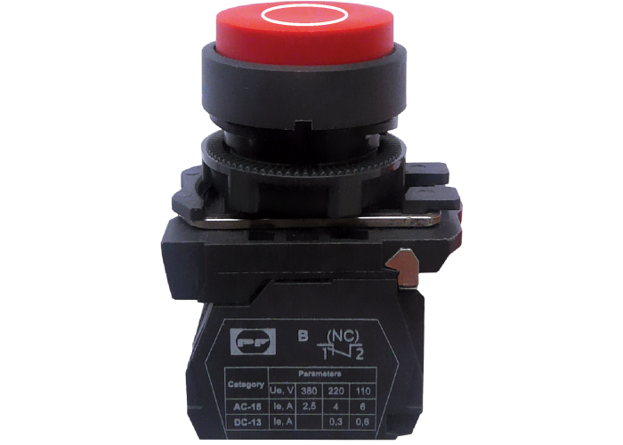 Выключатель кнопочный FP выступающий нажимной толкатель, без фиксации. Цвет: красный с маркировкой круг. Используется в промышленных распределительных устройствах, пультах управления промышленным оборудованием, а также для управления технологическими процессами и системах автоматизации.