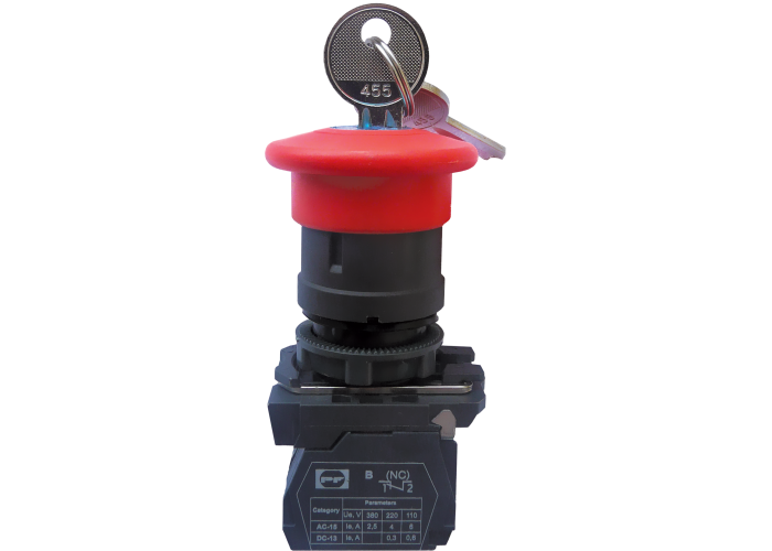 Выключатель кнопочный FP типа "грибок" с ключом, с фиксацией, возврат-повотором. Цвет: красный. Используется в промышленных распределительных устройствах, пультах управления промышленным оборудованием, а также для управления технологическими процессами и системах автоматизации.