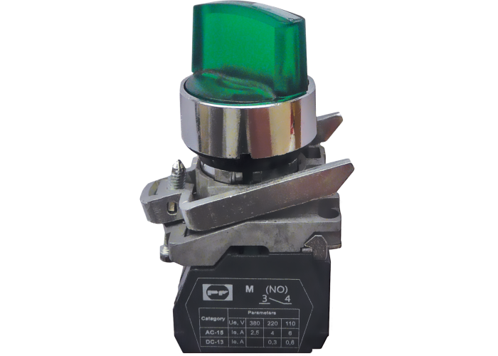 Выключатель кнопочный FP4-BK переключатель, 2-х позиционный с подсветкой. Цвет: зеленый. Используется в промышленных распределительных устройствах, пультах управления промышленным оборудованием, а также для управления технологическими процессами и системах автоматизации.