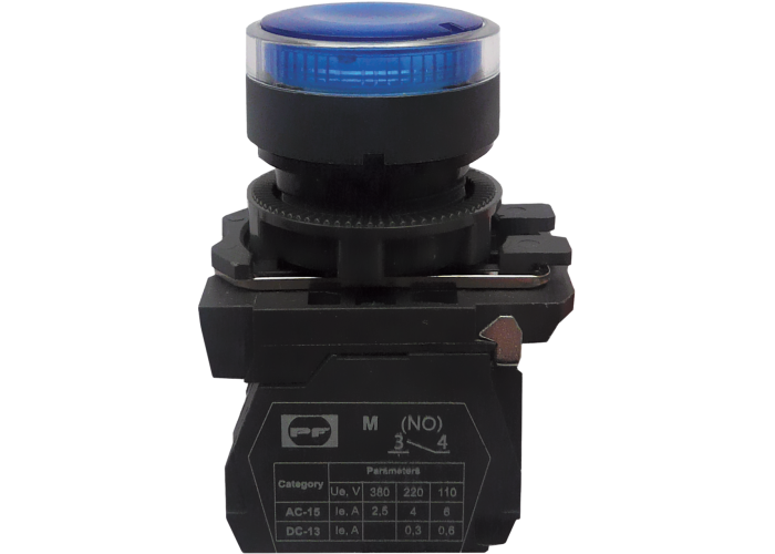 Выключатель кнопочный FP нажимной толкатель, без фиксации, со светодиодной индикацией. Используется в промышленных распределительных устройствах, пультах управления промышленным оборудованием, а также для управления технологическими процессами и системах автоматизации.