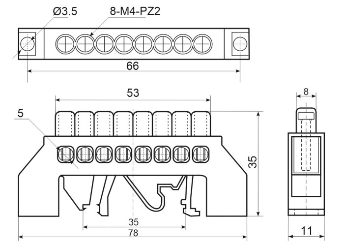 Шина нулевая изолированная STF используется для разветвления нулевых (N) проводников в щитовом оборудовании. Изделие производится из латуни с добавлением меди, что в свою очередь отлично сказывается для уменьшения сопротивления и улучшения контакта. Фиксация выполняется через корпус, обладающий изоляционными свойствами и позволяющий выполнить установку на: панель щита; DIN-рейку. Преимущества нулевых изолированных шин: высокое качество, простота монтажа, небольшие габариты, долговечность, упрощение ремонтных работ, повышение безопасности благодаря ограничению доступа к токоведущим частям, доступная стоимость. Монтажное отверстие: 5мм; номинальный ток, In: 63А; сечение присоединяемого проводника мм.кв:1,5-10; количество отверстий: 4, 6, 8, 10, 12; материал: корпус - не поддерживающий горение ПВХ, шина - латунь с добавлением меди.