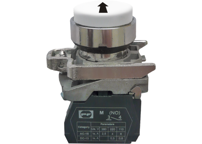Вимикач кнопковий FP виступаючий натискний штовхач, без фіксації. Колір: білий з маркуванням. Використовується в промислових розподільчих пристроях, пультах керування промисловим обладнанням, а також для керування технологічними процесами і в системах автоматизації.