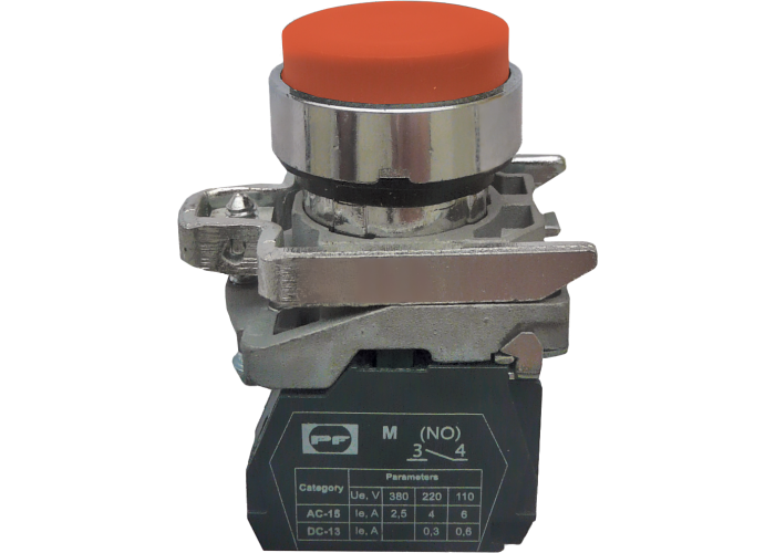 Вимикач кнопковий FP виступаючий натискний штовхач, без фіксації. Колір: червоний. Використовується в промислових розподільчих пристроях, пультах керування промисловим обладнанням, а також для керування технологічними процесами і в системах автоматизації.