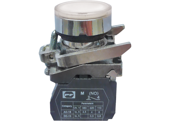 Вимикач кнопковий FP натискний штовхач, без фіксації, зi світлодіодною індикацією. Використовується в промислових розподільчих пристроях, пультах керування промисловим обладнанням, а також для керування технологічними процесами і в системах автоматизації.