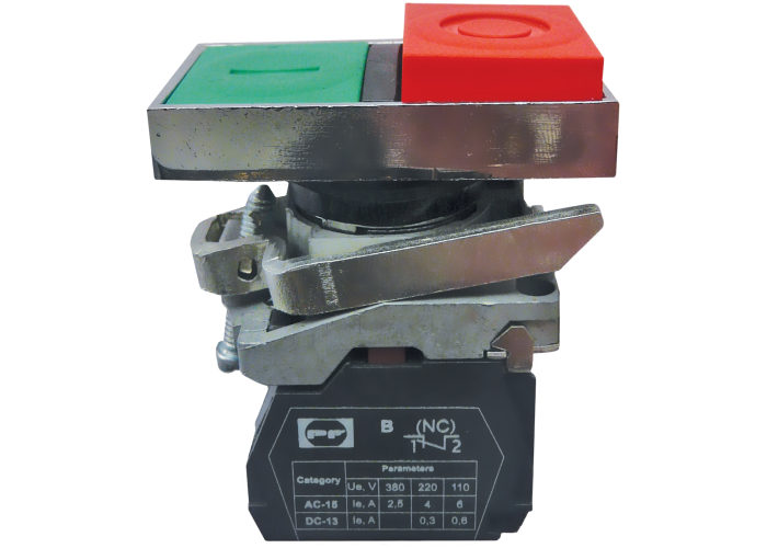 Вимикач кнопковий FP Prec прямокутний перемикач Start-Stop. Колір: червоно-зелений. Використовується в промислових розподільчих пристроях, пультах керування промисловим обладнанням, а також для керування технологічними процесами і в системах автоматизації.