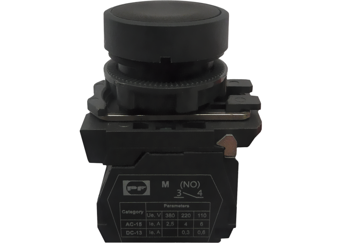 Вимикач кнопковий FP потайний натискний штовхач, без фіксації. Колір: чорний. Використовується в промислових розподільчих пристроях, пультах керування промисловим обладнанням, а також для керування технологічними процесами і в системах автоматизації.