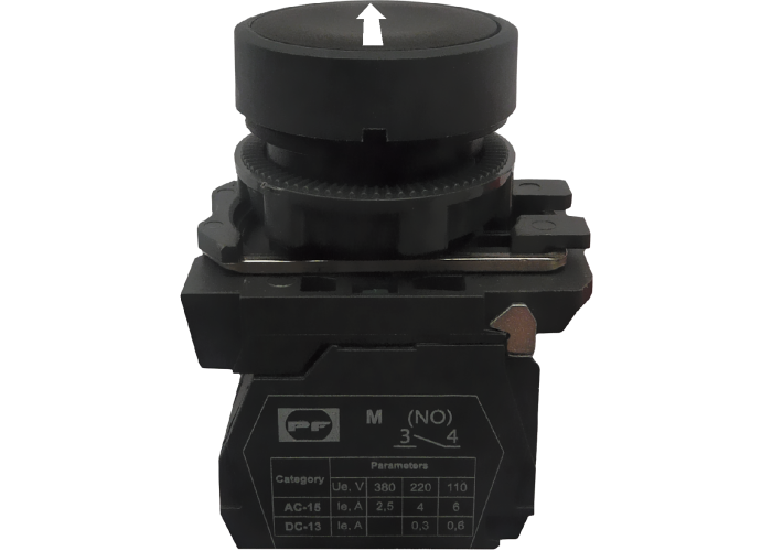 Вимикач кнопковий FP потайний натискний штовхач, без фіксації. Колір: чорний з маркуванням. Використовується в промислових розподільчих пристроях, пультах керування промисловим обладнанням, а також для керування технологічними процесами і в системах автоматизації.
