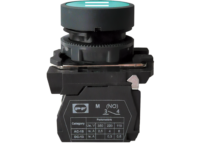 Вимикач кнопковий FP потайний натискний штовхач, без фіксації. Колір: зелений з маркуванням ІІ. Використовується в промислових розподільчих пристроях, пультах керування промисловим обладнанням, а також для керування технологічними процесами і в системах автоматизації.
