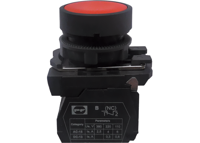 Вимикач кнопковий FP потайний натискний штовхач, без фіксації. Колір: червоний. Використовується в промислових розподільчих пристроях, пультах керування промисловим обладнанням, а також для керування технологічними процесами і в системах автоматизації.