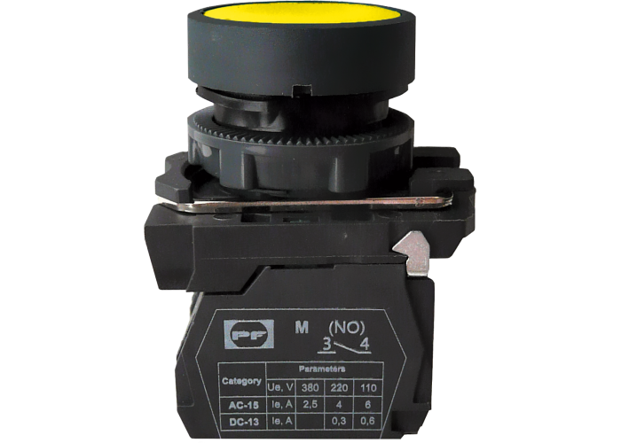 Вимикач кнопковий FP потайний натискний штовхач, без фіксації. Колір: жовтий. Використовується в промислових розподільчих пристроях, пультах керування промисловим обладнанням, а також для керування технологічними процесами і в системах автоматизації.