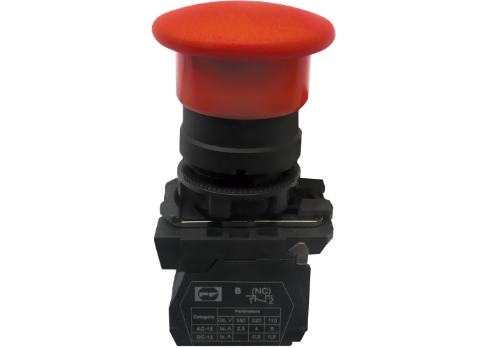 Вимикач кнопковий FP типу "грибок", без фіксації. Колір: червоний. Використовується в промислових розподільчих пристроях, пультах керування промисловим обладнанням, а також для керування технологічними процесами і в системах автоматизації.